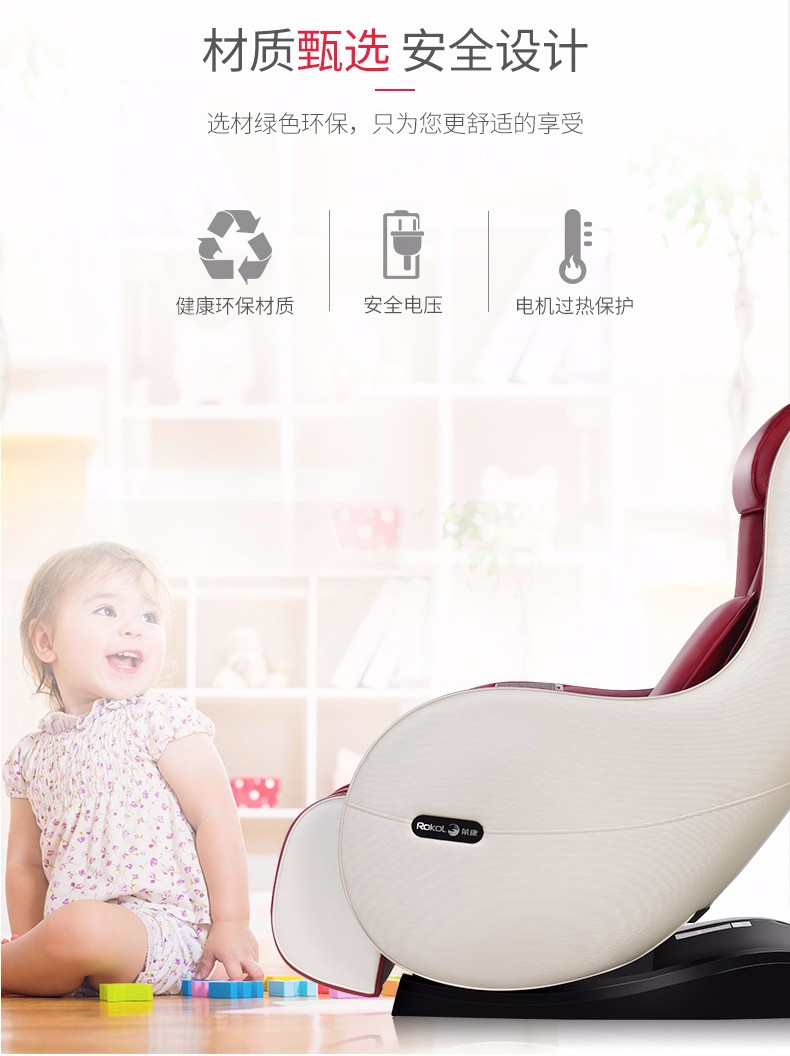 额定功率:95w 额定电压:220v50hz 定时:10/20/30 尺寸:椅背直立:112.5*68.5*111.5cm 椅背后仰:140.8*68.5*77cm 净重:约50kg 专利东方手感超薄按摩机芯 超长L型曲线导轨 按摩轮加热按摩 座部、腿部气压按摩 零重力、音乐按摩放松身心 时尚外观 家居首选
